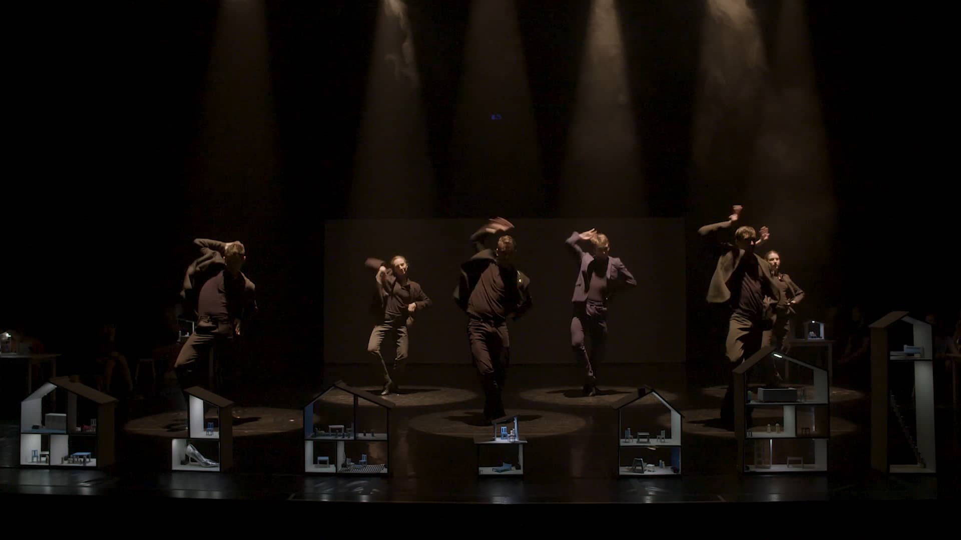 Dans la première partie du spectacle, nous pouvons voir en premier plan, de nombreuses maisons de poupées illuminées misent les unes à côté des autres.